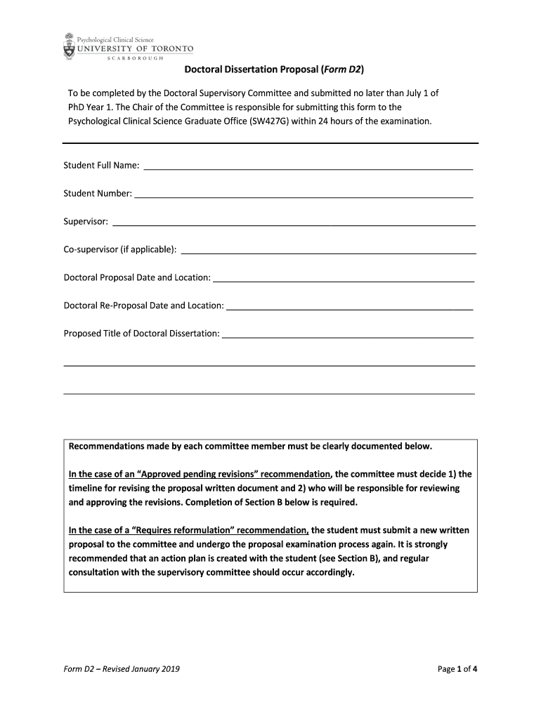Doctoral Dissertation Proposal (Form D2) To be completed by the Doctoral Supervisory Committee and submitted no later than July 1 of PhD Year 1. The Chair of the Committee is responsible for submitting