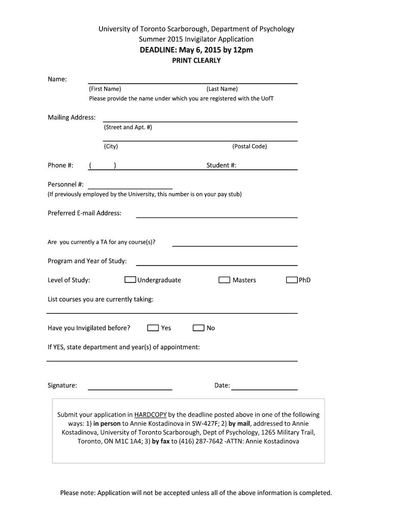 Summer 2015 Invigilator ApplicationDEADLINE: May 6, 2015, by 12pm