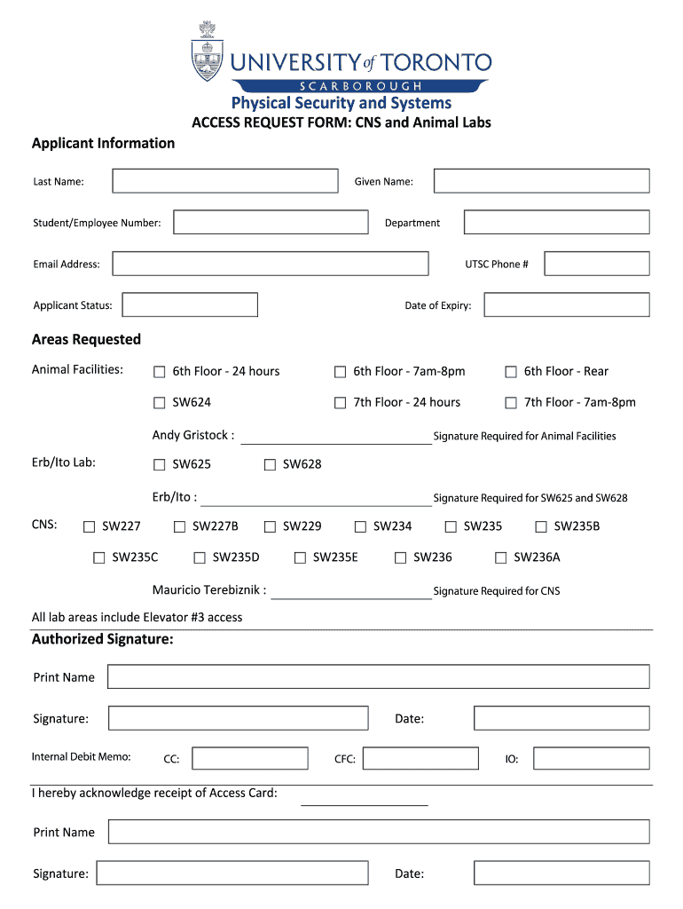 Physical Security and SystemsACCESS REQUEST FORM: CNS and Animal Labs Applicant Information Last Name:Given Name:Student/Employee Number:Departmental Address:UTC Phone # Date of Expiry:Applicant Status:Areas