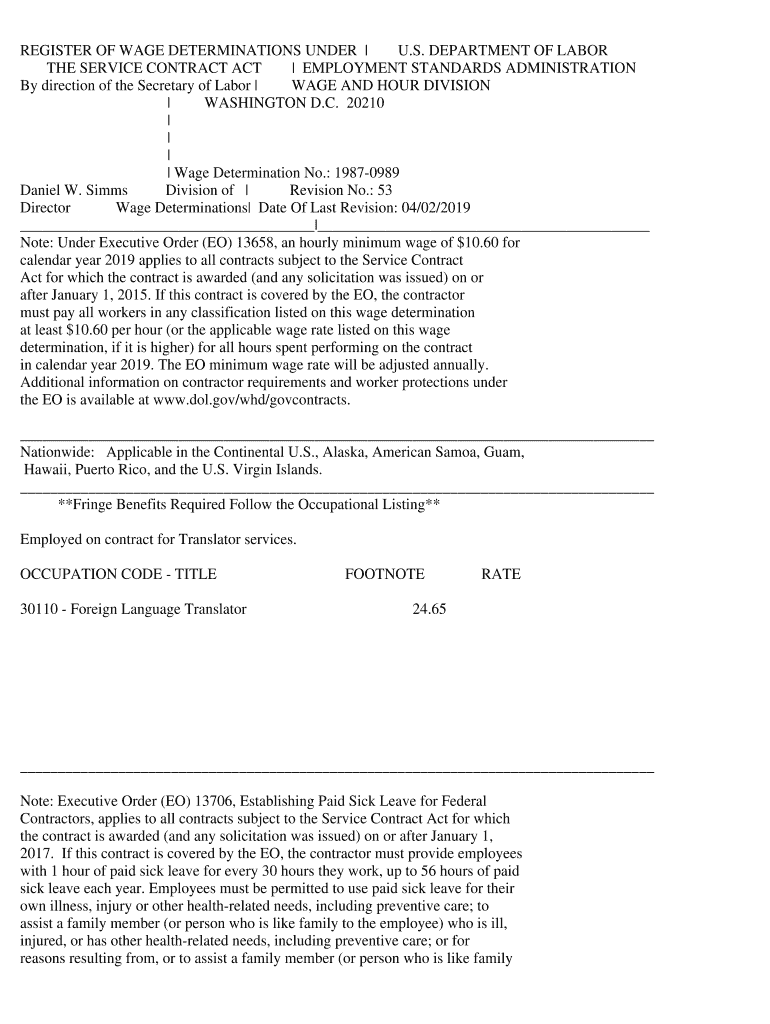 REGISTER OF WAGE DETERMINATIONS UNDER U.S. DEPARTMENT OF LABOR THE SERVICE CONTRACT ACT EMPLOYMENT STANDARDS ADMINISTRATION By direction of the Secretary of Labor WAGE AND HOUR DIVISION WASHINGTON