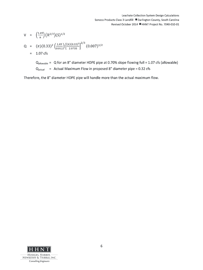 Leachate Collection System Design Calculations Monaco Products Class 3 Landfill Darlington County, South Carolina Revised October 2014 HUNT Project No. 704001001V Q 1.49n R2/3 (S)1/2()(0.33)2 1.07