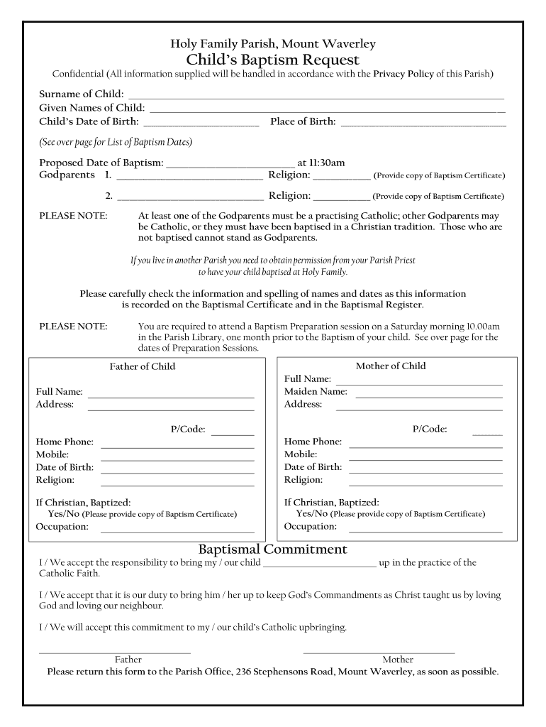 Holy Family Parish, Mount WaverleyChilds Baptism RequestConfidential (All information supplied will be handled in accordance with the Privacy Policy of this Parish)Surname of Child: Given Names of