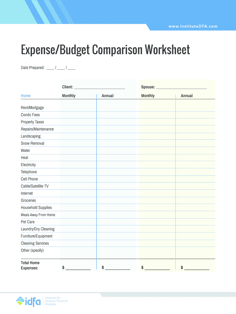 WWW. Inst ituteDFA.comExpense/Budget Comparison Worksheet Date Prepared: / / Homeliest: Spouse: MonthlyAnnualMonthlyAnnual$ $ $ $ Rent/Mortgage Condo Fees Property Taxes Repairs/Maintenance Landscaping