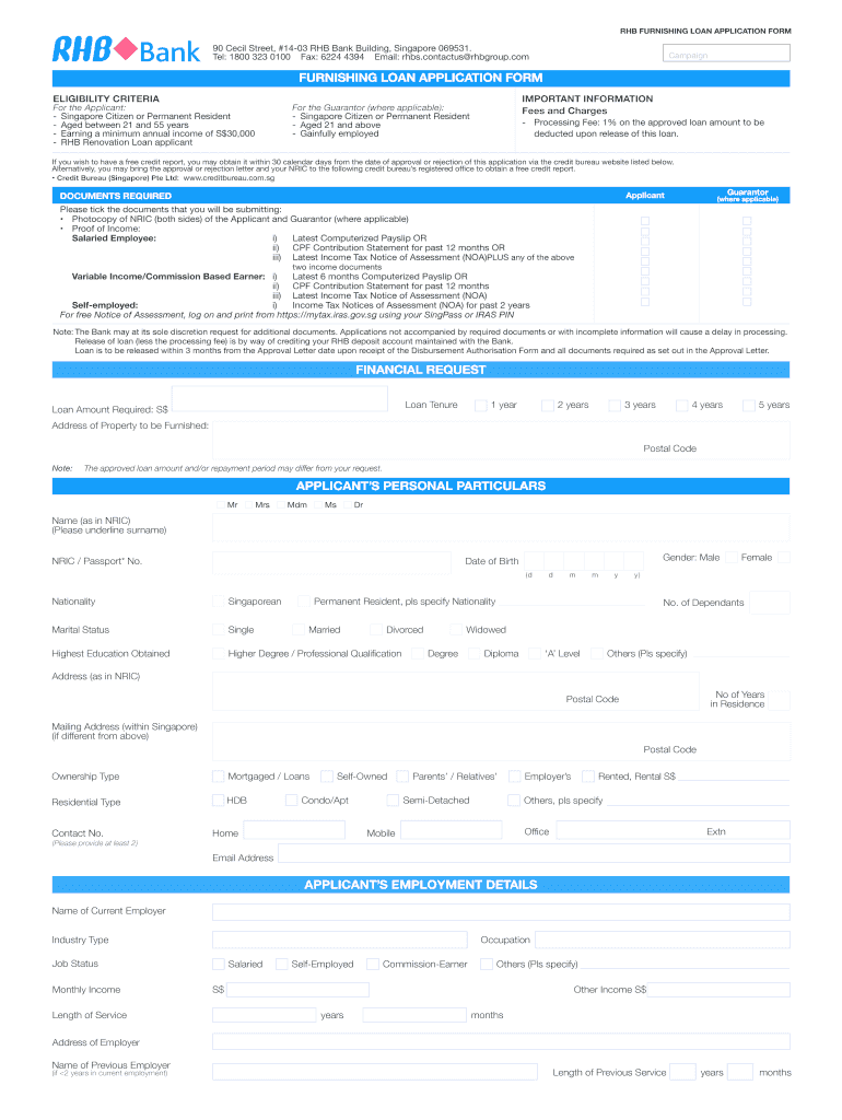 ROB FURNISHING LOAN APPLICATION FORM90 Cecil Street, #1403 ROB Bank Building, Singapore 069531. Tel: 1800 323 0100 Fax: 6224 4394 Email: ribs. Contacts subgroup.comCampaignFURNISHING LOAN APPLICATION