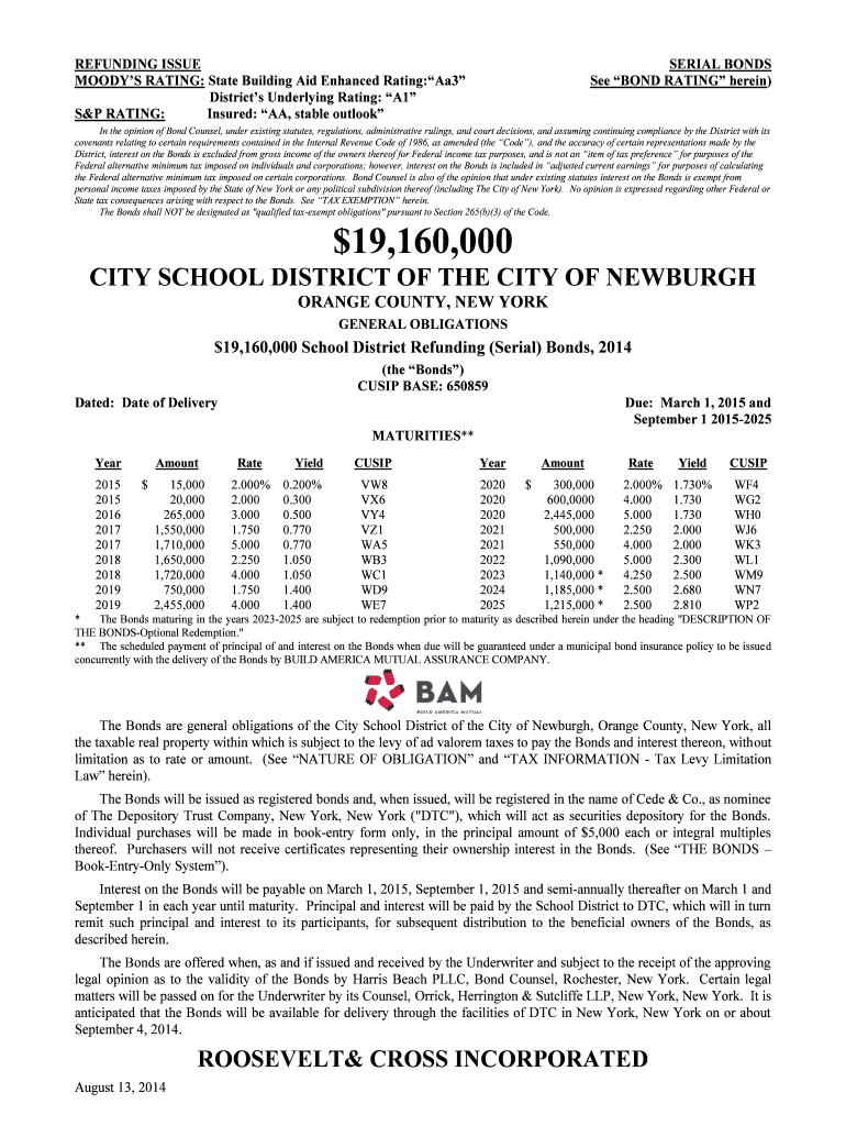 REFUNDING ISSUE MOODY RATING: State Building Aid Enhanced Rating:Aa3 Districts Underlying Rating: A1 S&P RATING: Insured: AA, stable outlookSERIAL BONDS See BOND RATING herein)In the opinion of Bond