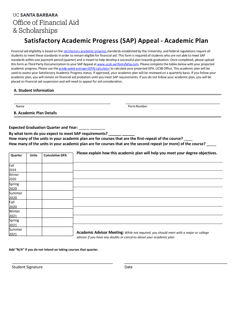 Satisfactory Academic Progress (SAP) Appeal Academic Plan Financial aid eligibility is based on the satisfactory academic progress standards established by the University, and federal regulations