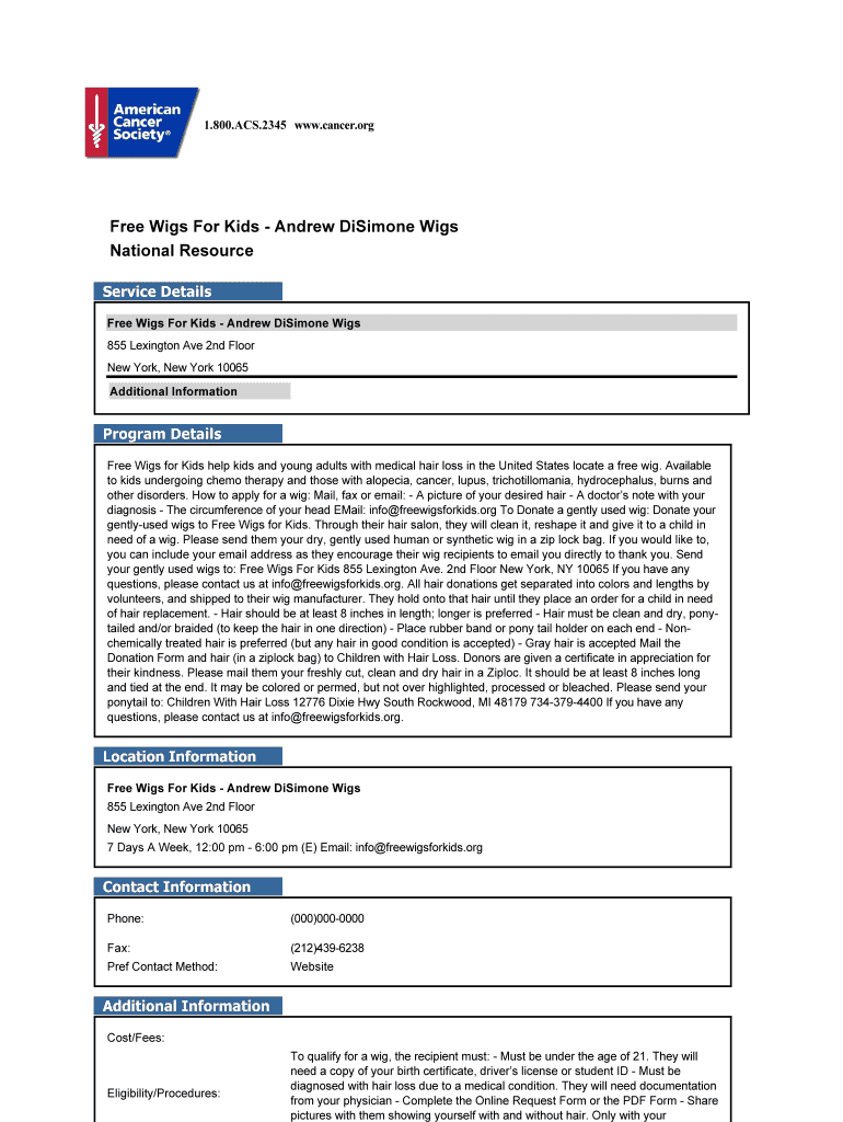 1.800.ACS.2345 www.cancer.orgFreeWigsForKidsAndrewDiSimoneWigs NationalResource ServiceDetails FreeWigsForKidsAndrewDiSimoneWigs 855LexingtonAve2ndFloor New York,NewYork10065 AdditionalInformationProgramDetails
