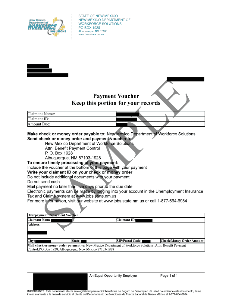 STATEOFNEWMEXICO NEWMEXICODEPARTMENTOF WORKFORCESOLUTIONS POBOX1928 Albuquerque,NM87103 www.dws.state.nm.usPage1TriggerSA M PL EPaymentVoucher Keepthisportionforyourrecords ClaimantName: Claimant