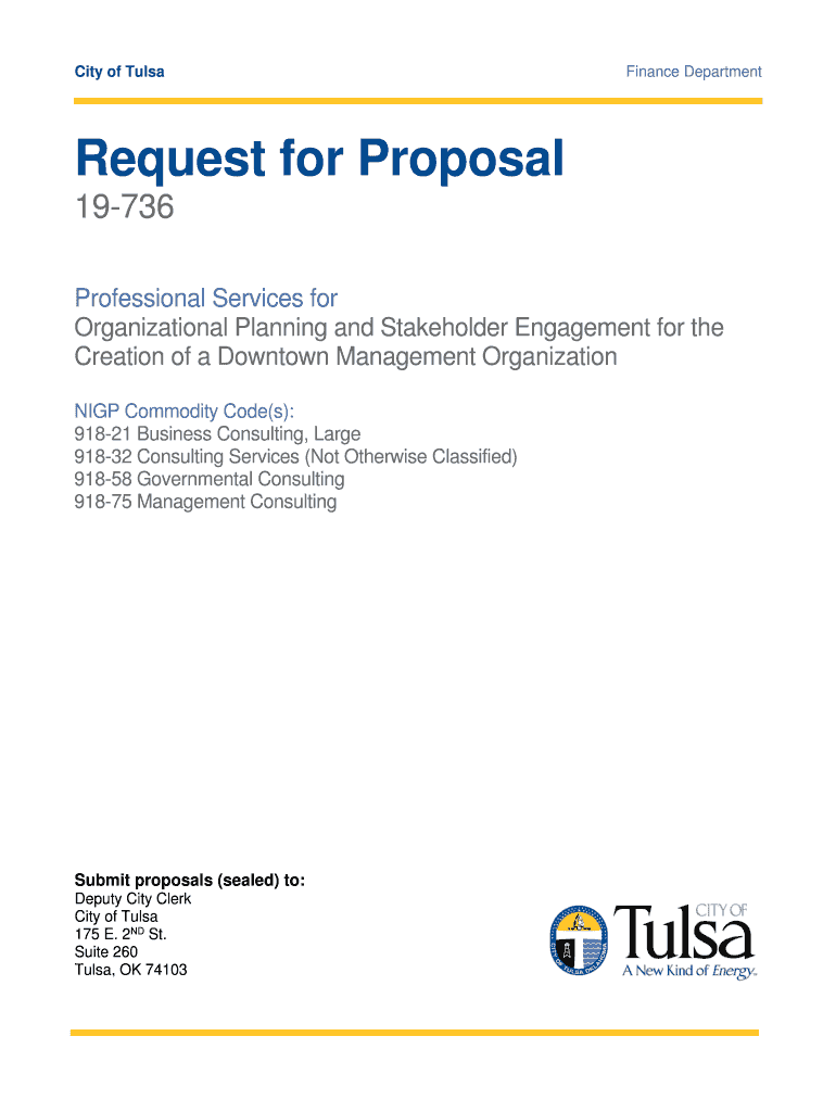 City of TulsaFinance DepartmentRequest for Proposal 19736 Professional Services for Organizational Planning and Stakeholder Engagement for the Creation of a Downtown Management Organization NIGH Commodity