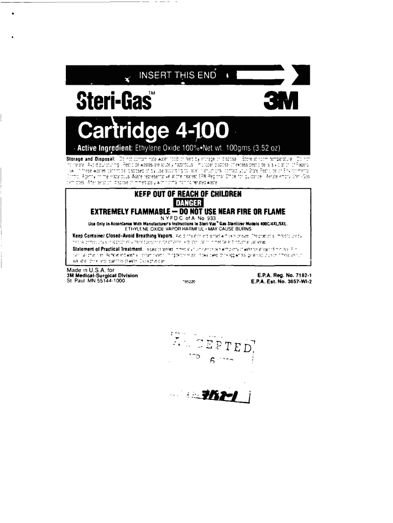 , INSERT TI:IIS END. “,M3MSteriGasCar ridge 4100, Active Ingredient: Ethylene Oxide 1OO% 'Net I'll. 1OOgms (352 AZ), Storage and Disposal: :: :: :::3 :: ':2 ... :;:e '::: : 'ff: ::, ': ';; : :::53