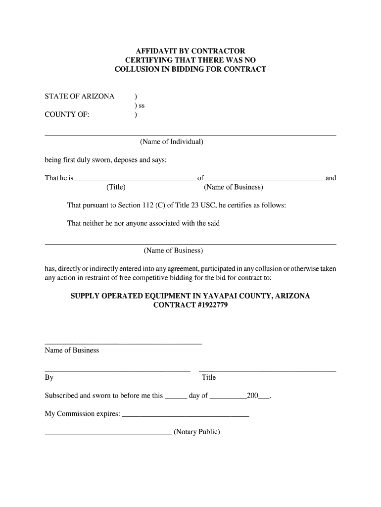 AFFIDAVIT BY CONTRACTOR CERTIFYING THAT THERE WAS NO COLLUSION IN BIDDING FOR CONTRACTSTATE OF ARIZONA COUNTY OF:)) SS) (Name of Individual) being first duly sworn, deposes and says: That he is of
