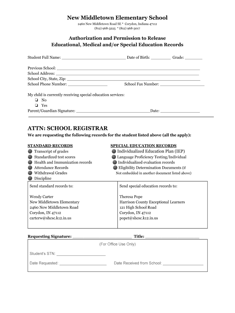 New Middletown Elementary School 2460 New Middletown Road SE * Cordon, Indiana 47112 (812) 9683225 * (812) 9683017Authorization and Permission to Release Educational, Medical and/or Special Education