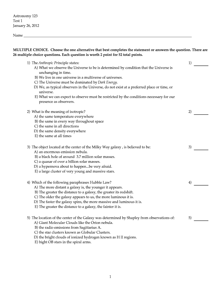 Astronomy 123 Test 1 January 26, 2012, Name MULTIPLE CHOICE. Choose the one alternative that best completes the statement or answers the question. There are 26 multiple choice questions. Each question