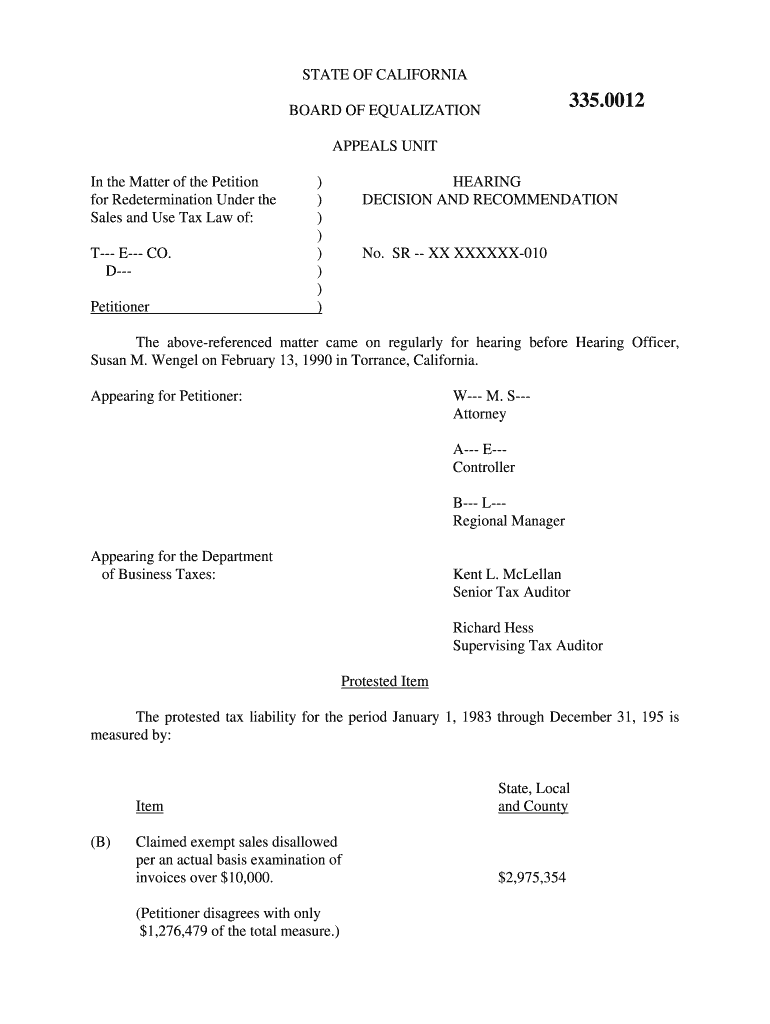 STATE OF CALIFORNIA335.0012BOARD OF EQUALIZATIONAPPEALS Uniting the Matter of the Petition for Redetermination Under the Sales and Use Tax Law of: T E CO. Petitioner))))))))HEARING DECISION AND RECOMMENDATION