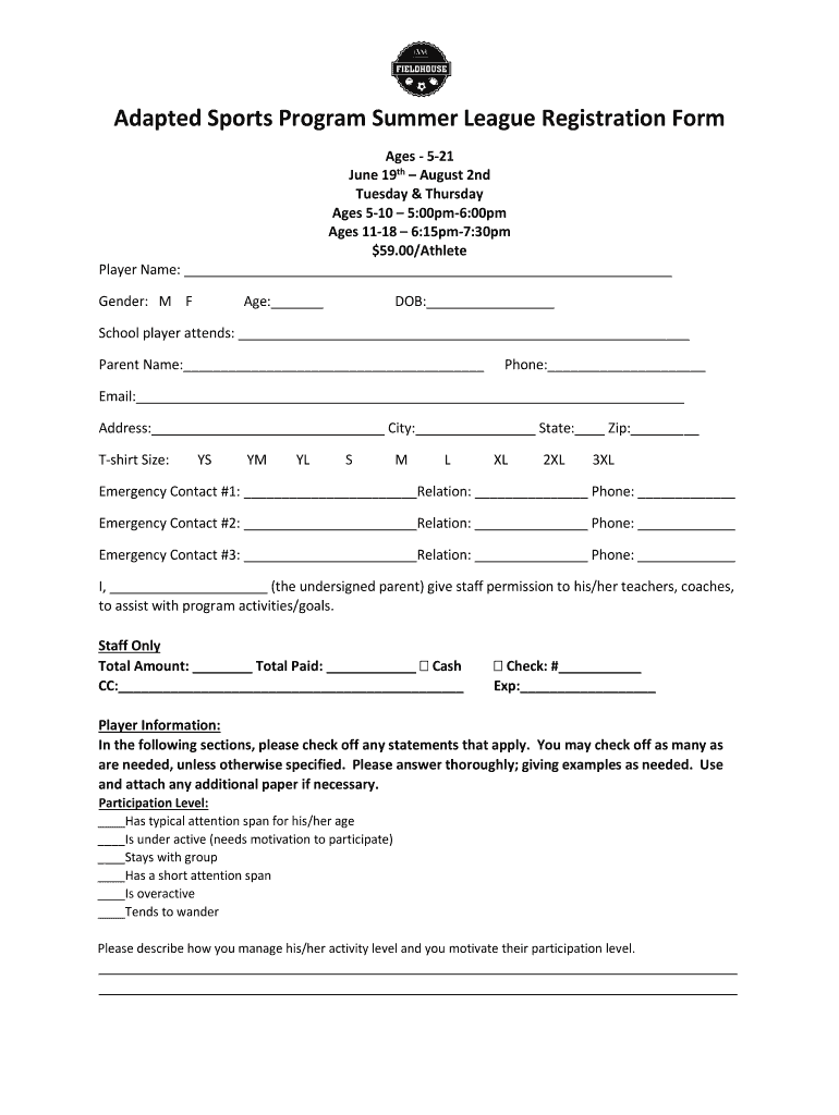 Adapted Sports Program Summer League Registration Form Ages 521 June 19th August 2nd Tuesday & Thursday Ages 510 5:00pm6:00pm Ages 1118 6:15pm7:30pm $59.00/Athlete Player Name: Gender: MF Age: DOB: