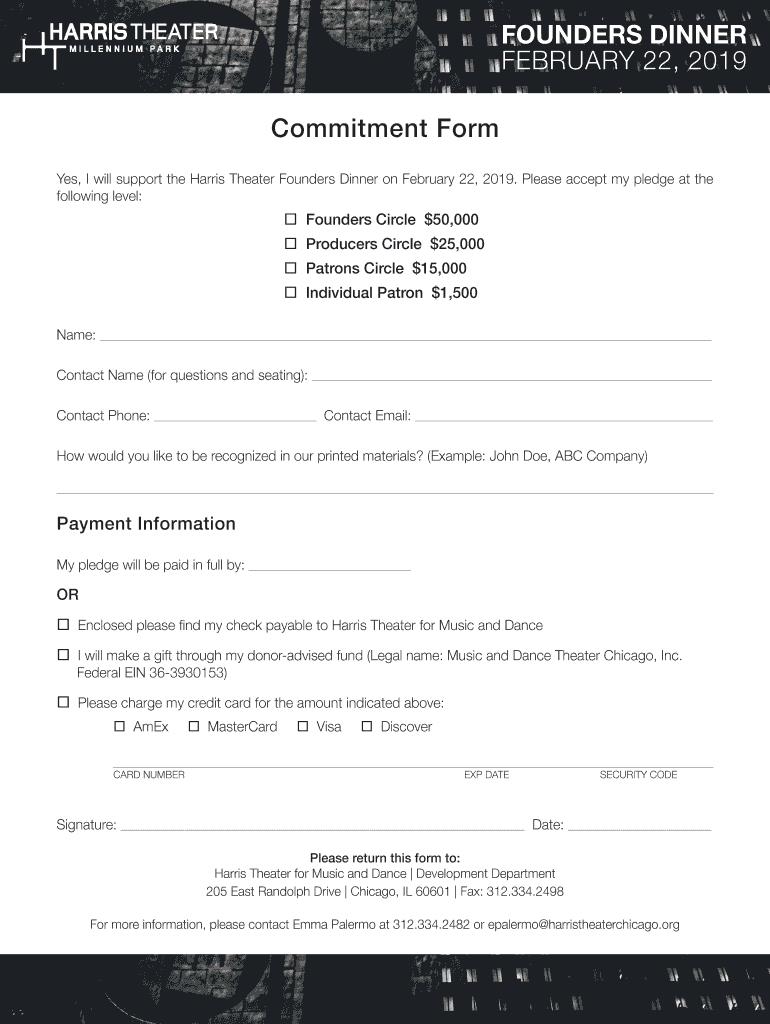 FOUNDERS DINNER FEBRUARY 22, 2019, Commitment Form Yes, I will support the Harris Theater Founders Dinner on February 22, 2019. Please accept my pledge at the following level: Founders Circle $50,000