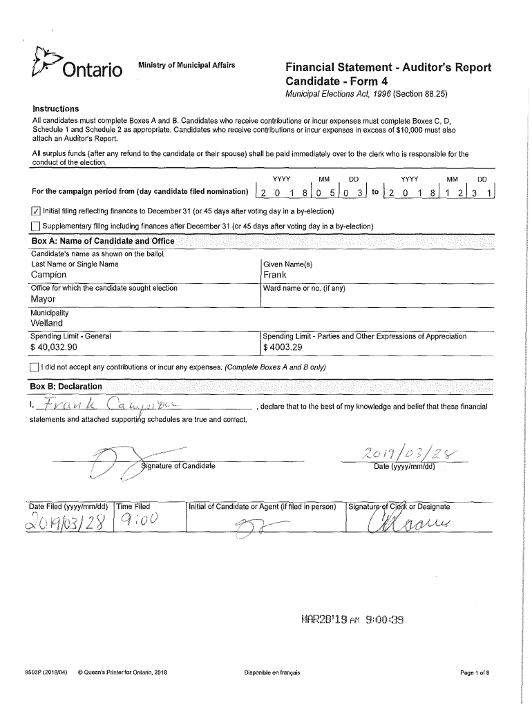 ('t?ontarioMinistry of Municipal AffairsFinancial Statement Auditor's Report Candidate Form 4 Municipal Elections Act, 1996 (Section 88.25)Instructions All candidates must complete Boxes A and B.