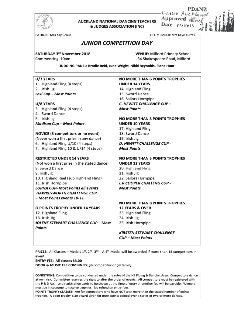 AUCKLAND NATIONAL DANCING TEACHERS & JUDGES ASSOCIATION (INC) PATRON: Mrs Kay Grout03/10/18LIFE MEMBER: Mrs Kaye TurrellJUNIOR COMPETITION DAY SATURDAY 3rd November 2018 Commencing 10amVENUE: Milford