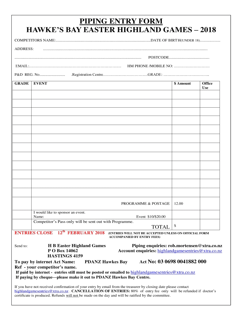 PIPING ENTRY FORM HAWKS BAY EASTER HIGHLAND GAMES 2018 COMPETITORS NAME:................................................................................................DATE OF BIRD H(UNDER 18).......................