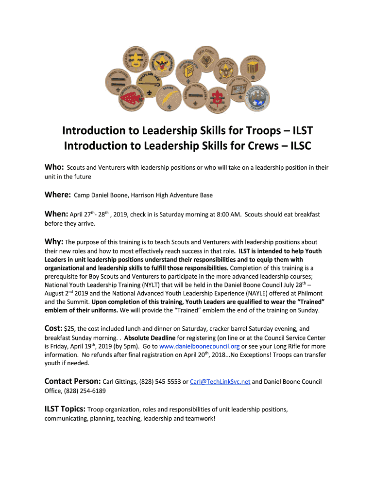 Introduction to Leadership Skills for Troops LST Introduction to Leadership Skills for Crews LSC Who:Scouts and Ventures with leadership positions or who will take on a leadership position in their