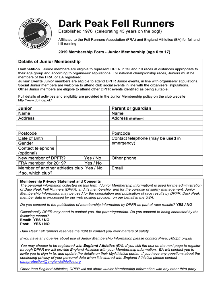 Dark Peak Fell Runners Established 1976 (celebrating 43 years on the bog!) Affiliated to the Fell Runners Association (FRA) and England Athletics (EA) for fell and hill running2019 Membership Form