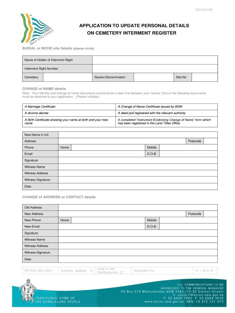 E2019/4182APPLICATION TO UPDATE PERSONAL DETAILS ON CEMETERY INTERMENT REGISTERBURIAL or NICHE site Details (please circle)Name of Holder of Interment Right Number CemeterySection/Denomination Site