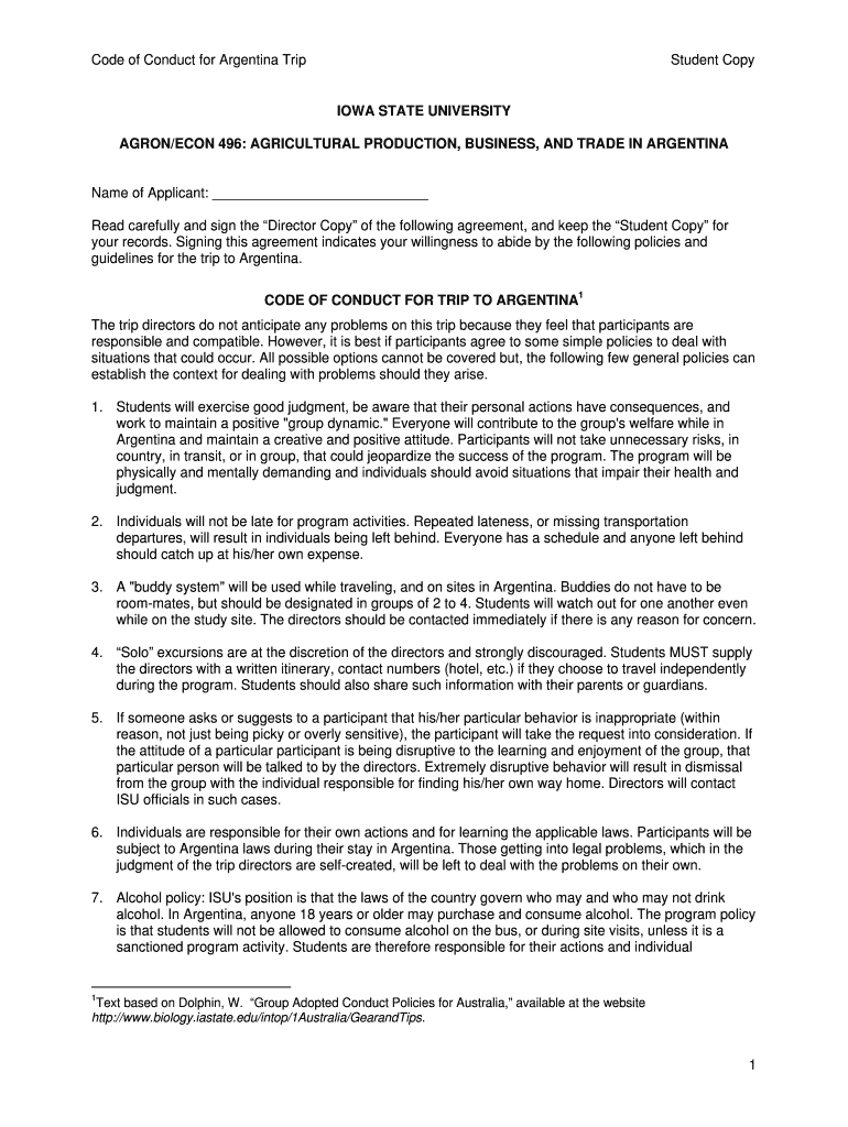 Code of Conduct for Argentina TripStudent Copying STATE UNIVERSITY AARON/ECON 496: AGRICULTURAL PRODUCTION, BUSINESS, AND TRADE IN ARGENTINAName of Applicant: Read carefully and sign the Director
