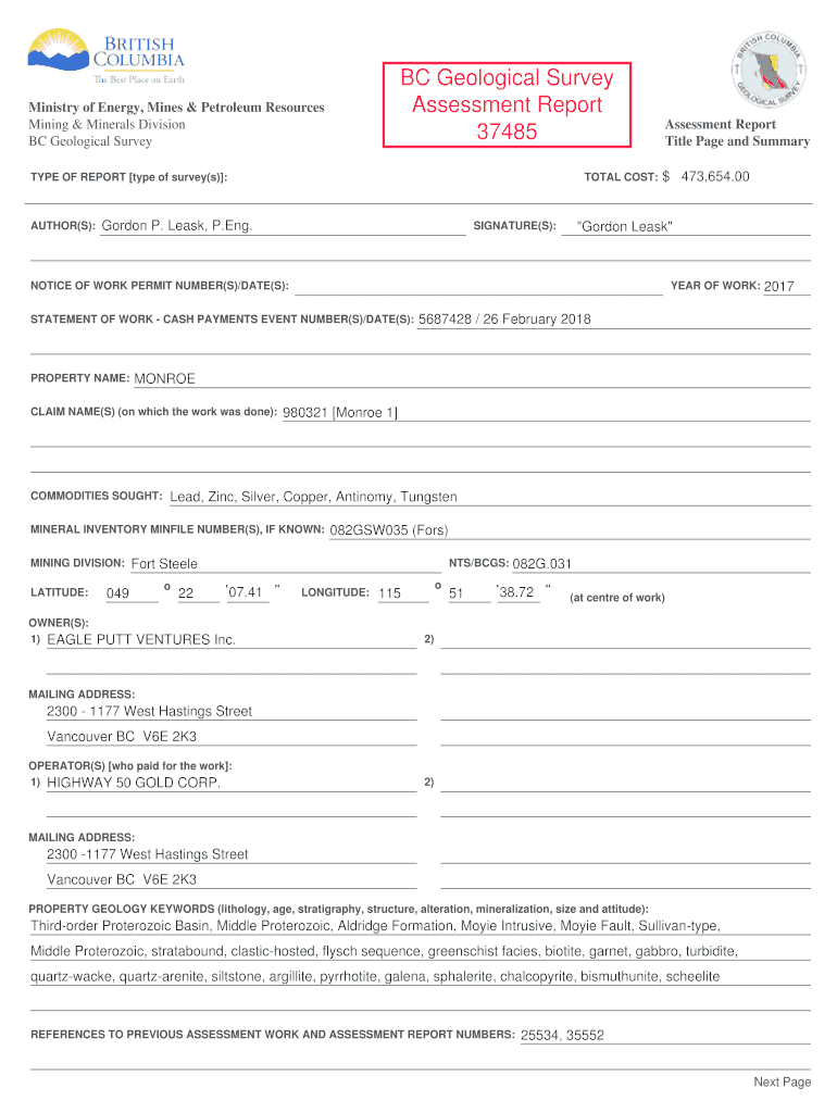 BC Geological Survey Assessment Report 37485Ministry of Energy, Mines & Petroleum Resources Mining & Minerals Division BC Geological Survey TYPE OF REPORT type of survey(s) :AUTHOR(S):TOTAL COST:Gordon