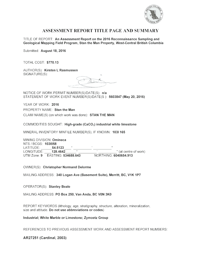 Geological Mapping Field Program, Stan the Man Property, West Central British