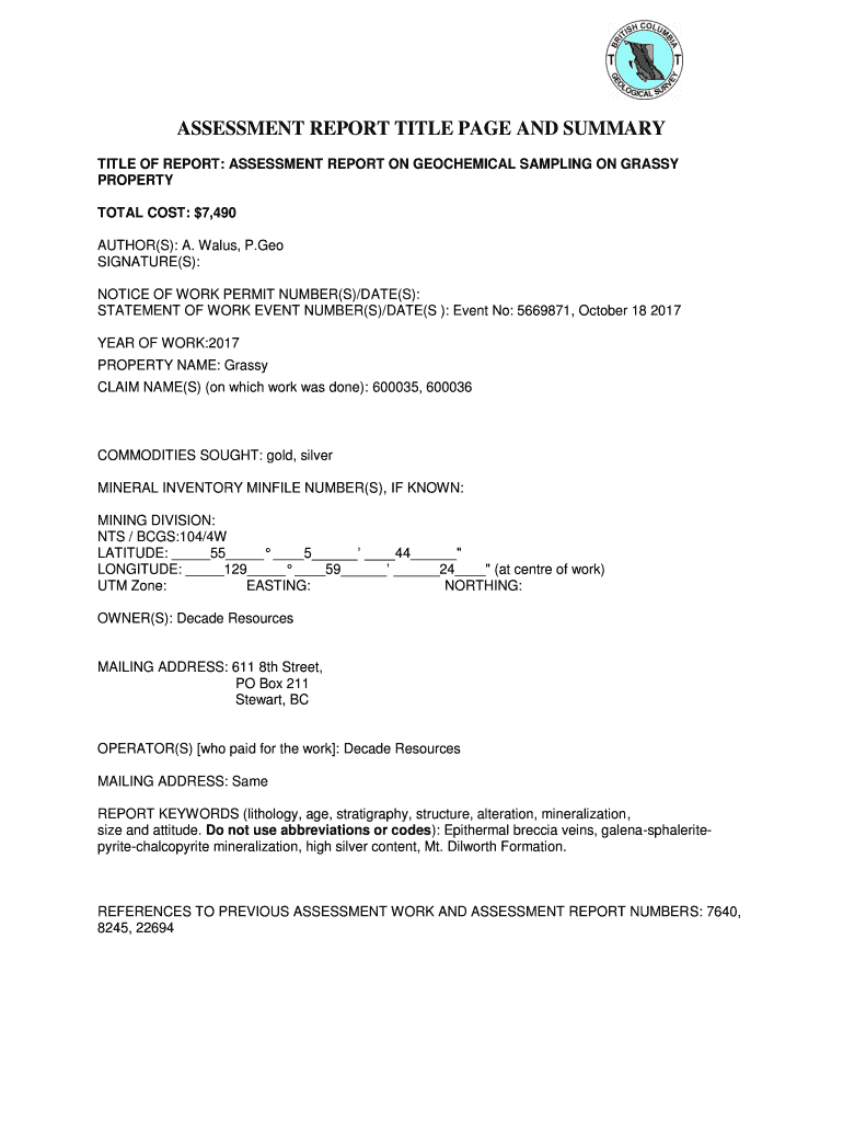 Get the free TITLE OF REPORT: ASSESSMENT REPORT ON GEOCHEMICAL SAMPLING ON GRASSY - aris empr gov bc
