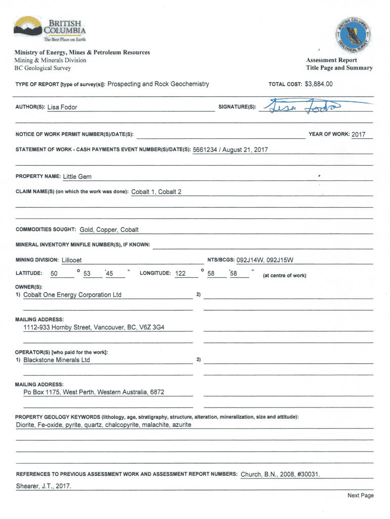 1l,e SL 'b E.RTT, Ministry of Energy, Mines & Petroleum Resources Mining & Minerals Division BC Geological Survey TYPE OF REPORT type of survey(s) :AUTHOR(S):Assessment Report Title Page and SummaryProspecting
