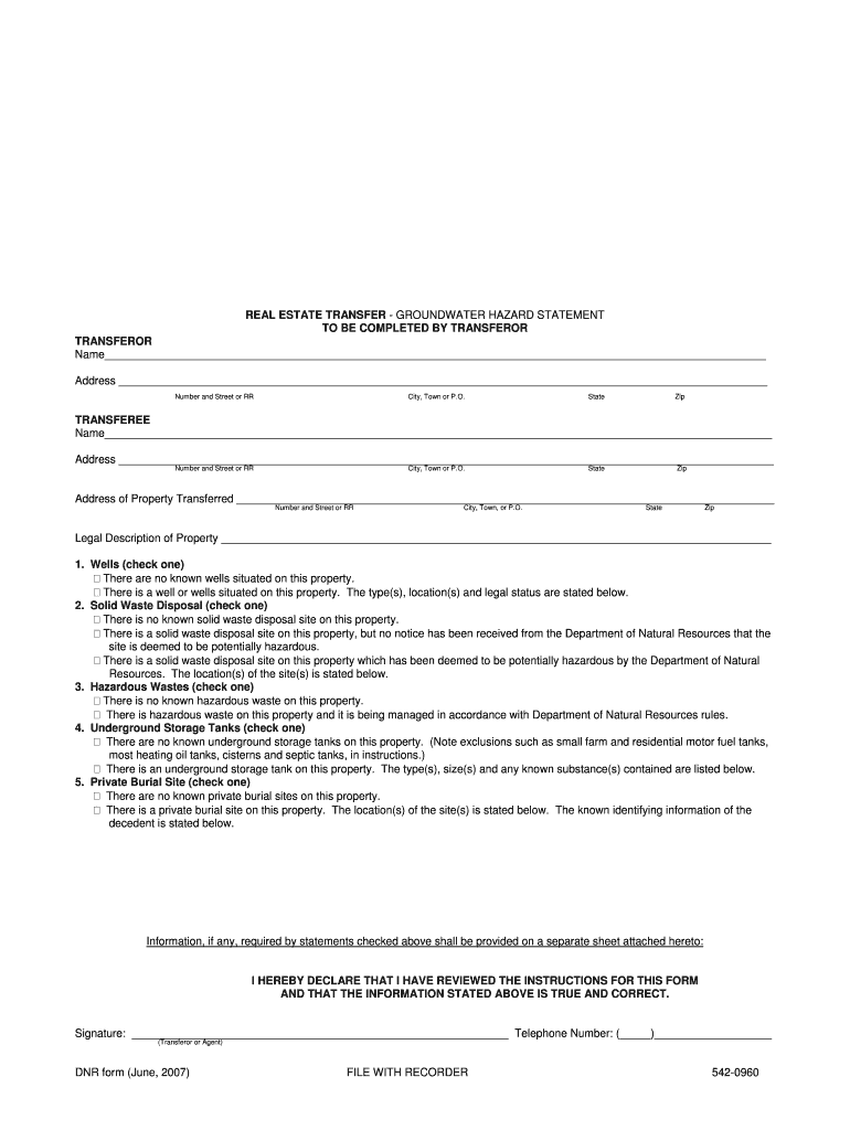 The Real Estate Transfer Groundwater Hazard Statement is a property disclosure form used by transferors in Iowa to disclose potential hazards related to groundwater on the property being transferred.