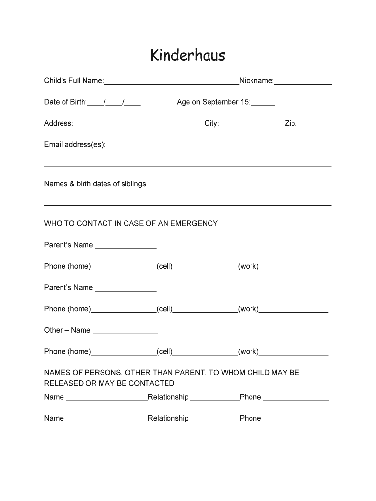 Kinderhaus Child's Full Name: Nickname: Date of Birth: / / Age on September 15: Address: City: Zip: Email address(BS): Names & birthdates of siblings WHO TO CONTACT IN CASE OF AN EMERGENCY Parents