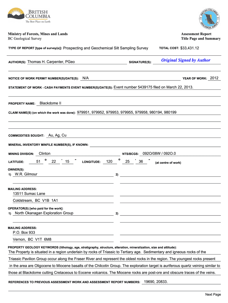Get the free AUTHOR(S): SIGNATURE(S): Thomas H. Carpenter, PGeo ... - aris empr gov bc