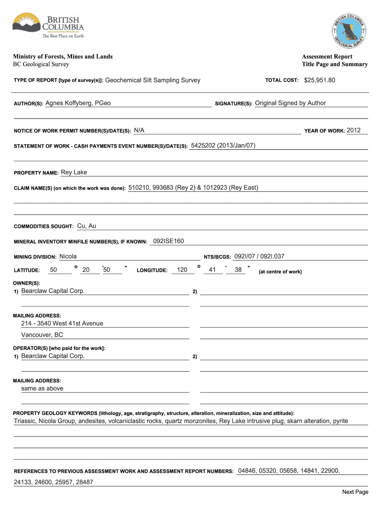 Get the free ARIS SUMMARY SHEET District Geologist, Prince George Off ... - aris empr gov bc