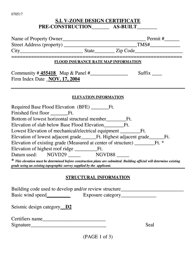 070517S. I. ZONE DESIGN CERTIFICATE PRECONSTRUCTION BUILT Name of Property Owner Permit # Street Address (property) TMS# City State Zip Code FLOOD INSURANCE RATE MAP INFORMATIONCommunity # 455418