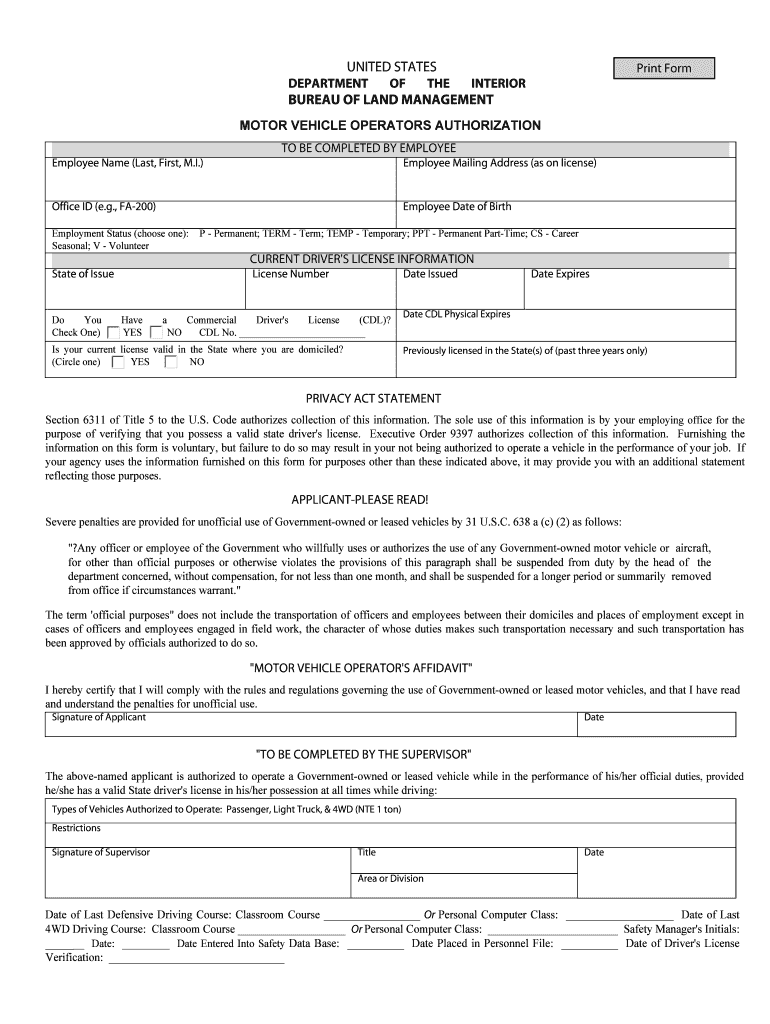 The US Motor Vehicle Operator Authorization Form is a professional license application used by employees of the US Bureau of Land Management to authorize their operation of government-owned or leased vehicles.