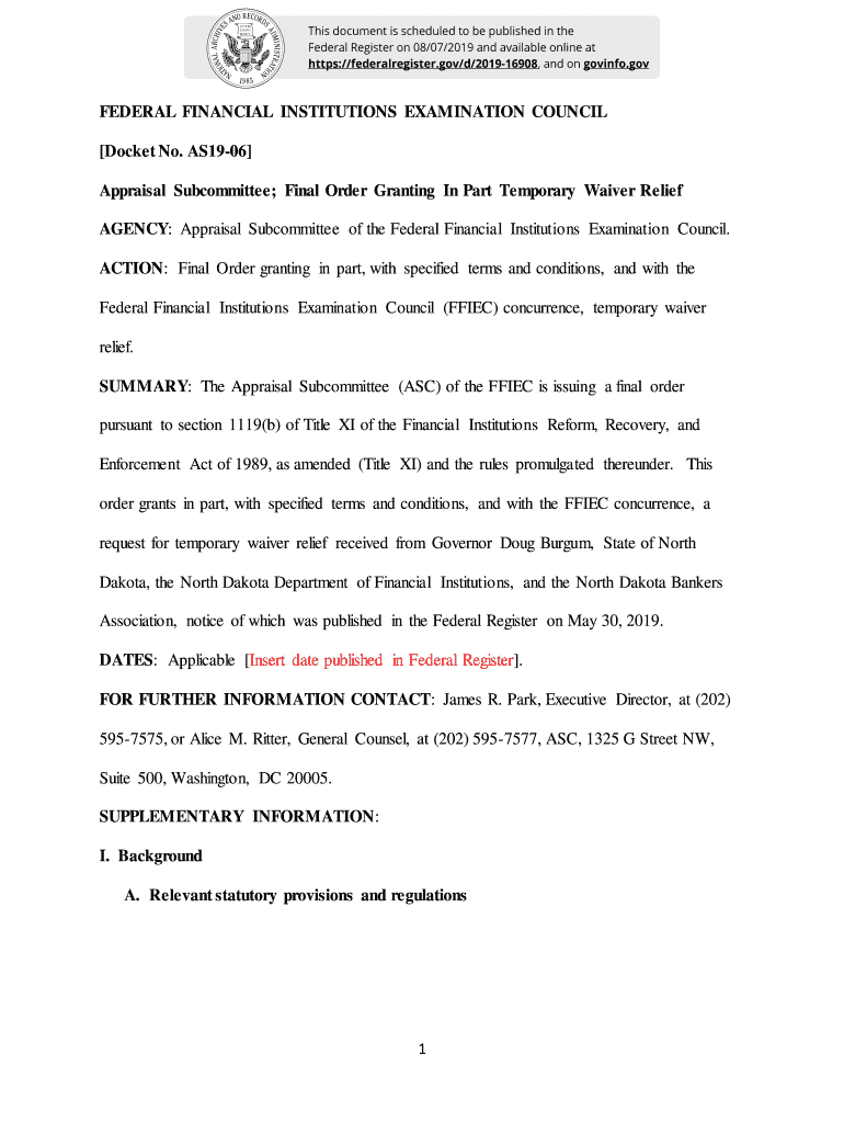 This document is scheduled to be published in the Federal Register on 08/07/2019 and available online at https://federalregister.gov/d/201916908, and on gov info. Confederal FINANCIAL INSTITUTIONS