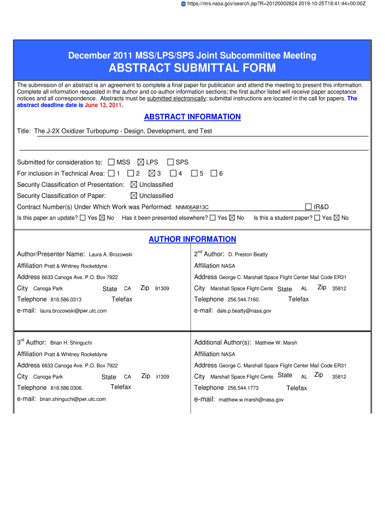 HTTPS://ntrs.nasa.gov/search.jsp? R20120002824 20191025T18:41:44+00:00ZDecember 2011 MSS/LPS/SPS Joint Subcommittee MeetingABSTRACT SUBMITTAL From
