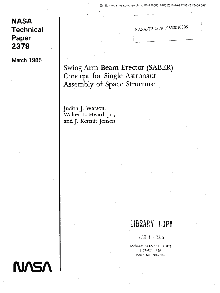 HTTPS://ntrs.nasa.gov/search.jsp? R19850010705 20191025T18:49:19+00:00ZNASATechnical ':NASATP2379 19850010705Paper 2379 March 1985SwingArm Beam Erector (SABER)Concept for Single Astronaut Assembly