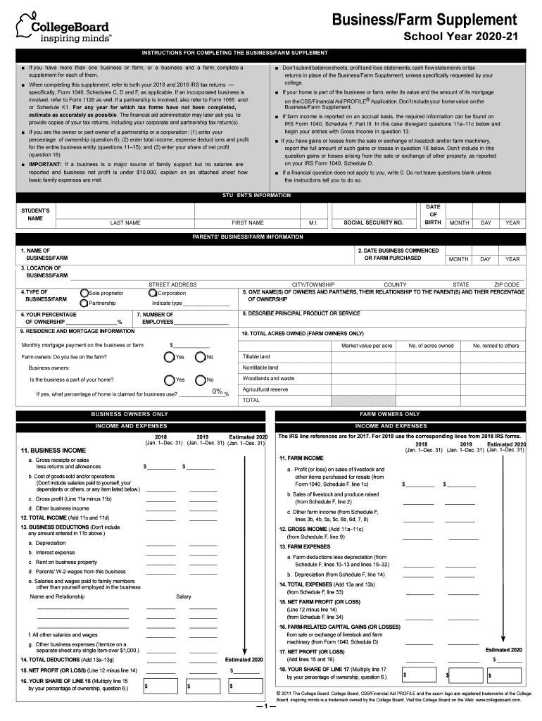 Business/Farm SupplementSchool Year 202021INSTRUCTIONS FOR COMPLETING THE BUSINESS/FARM SUPPLEMENT If you have more than one business or farm, or a business and a farm, complete a supplement for each