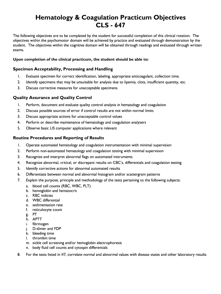 Hematology & Coagulation Practicum Objectives CLS 647 The following objectives are to be completed by the student for successful completion of this clinical rotation. The objectives within the psychomotor