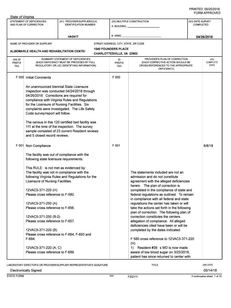 PRINTED: 05/25/2018 FORM APPROVEDState of Virginia STATEMENT OF DEFICIENCIES AND PLAN OF CORRECTION(X1) PROVIDER/SUPPLIER/CIA IDENTIFICATION NUMBER:ALBEMARLE HEALTH AND REHABILITATION CENTER (X4)
