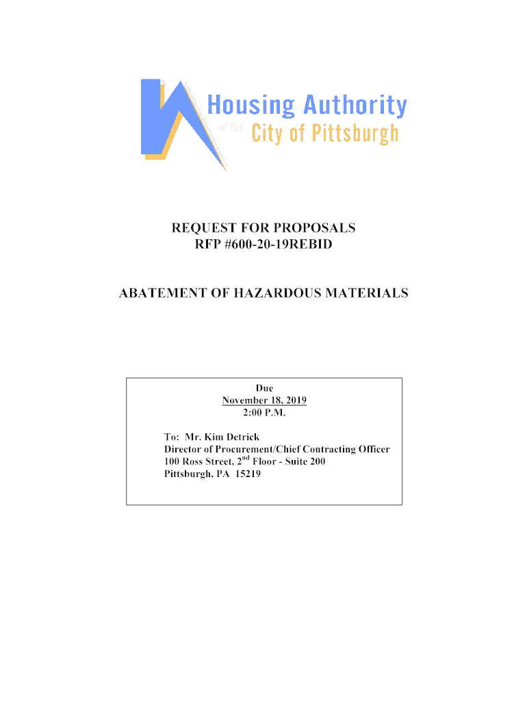 REQUEST FOR PROPOSALS RFP #6002019REBID ABATEMENT OF HAZARDOUS Materials November 18, 2019 2:00 P.M. To: Mr. Kim Derrick Director of Procurement/Chief Contracting Officer 100 Ross Street, 2nd Floor