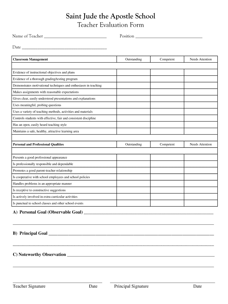 Saint Jude the Apostle School Teacher Evaluation Form Name of Teacher Position Date Classroom ManagementOutstandingCompetentNeeds AttentionOutstandingCompetentNeeds AttentionEvidence of instructional