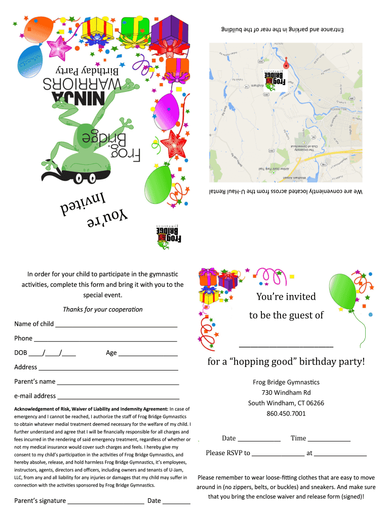 Entrance and parking in the rear of the buildingBirthday Party We are conveniently located across from the Haul Rental In order for your child to participate in the gymnastic activities, complete