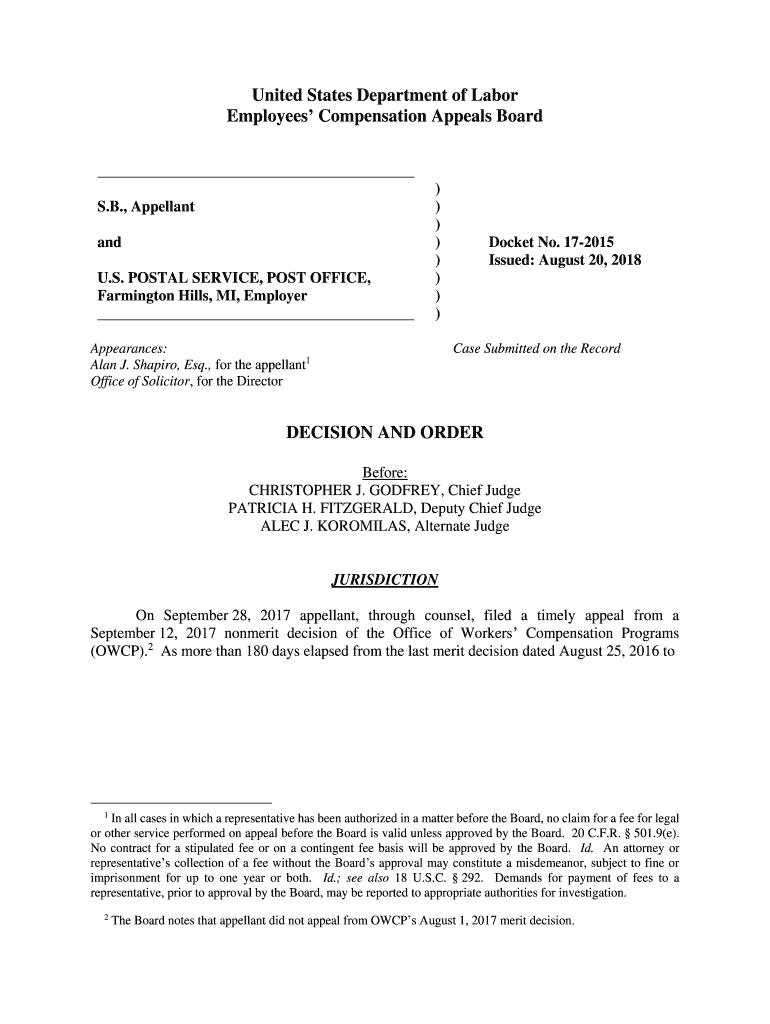 United States Department of Labor Employees Compensation Appeals Board S.B., Appellant and U.S. POSTAL SERVICE, POST OFFICE, Farmington Hills, MI, Employer))))))))Appearances: Alan J. Shapiro, Esq.,