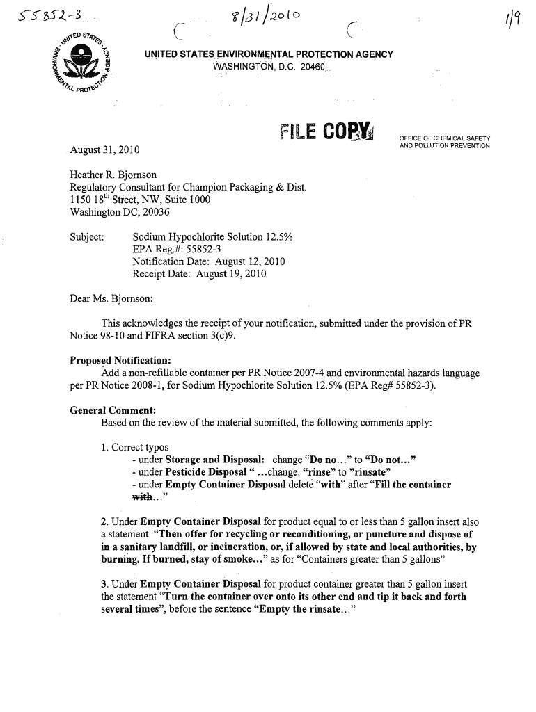 19 UNITED STATESENVIRONMI;NEAL PROTECTION AGENCY WASHINGTON, D.C. 20460 .FILE August 31,2010COOFFICE OF CHEMICAL SAFETY AND POLLUTION PREVENTION Heather R. Johnson Regulatory Consultant for Champion