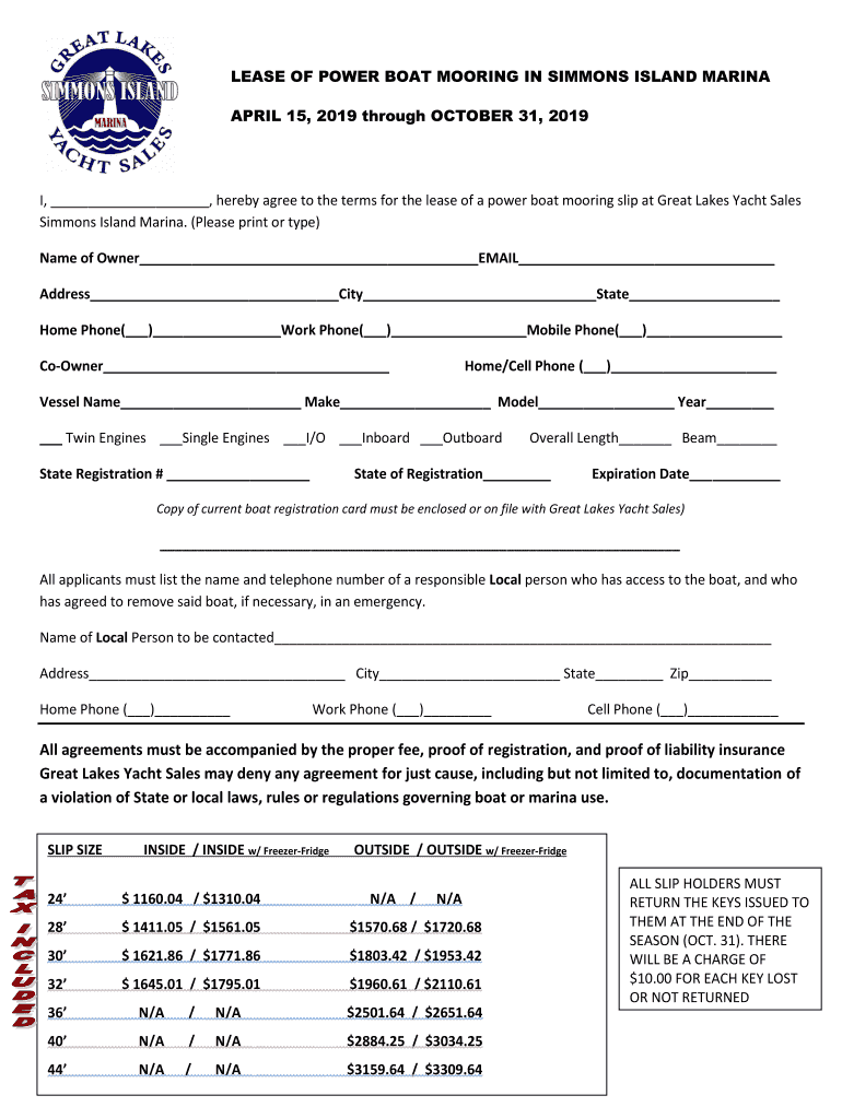 LEASE OF POWER BOAT MOORING IN SIMMONS ISLAND MARINA APRIL 15, 2019, through OCTOBER 31, 2019I, hereby agree to the terms for the lease of a power boat mooring slip at Great Lakes Yacht Sales Simmons