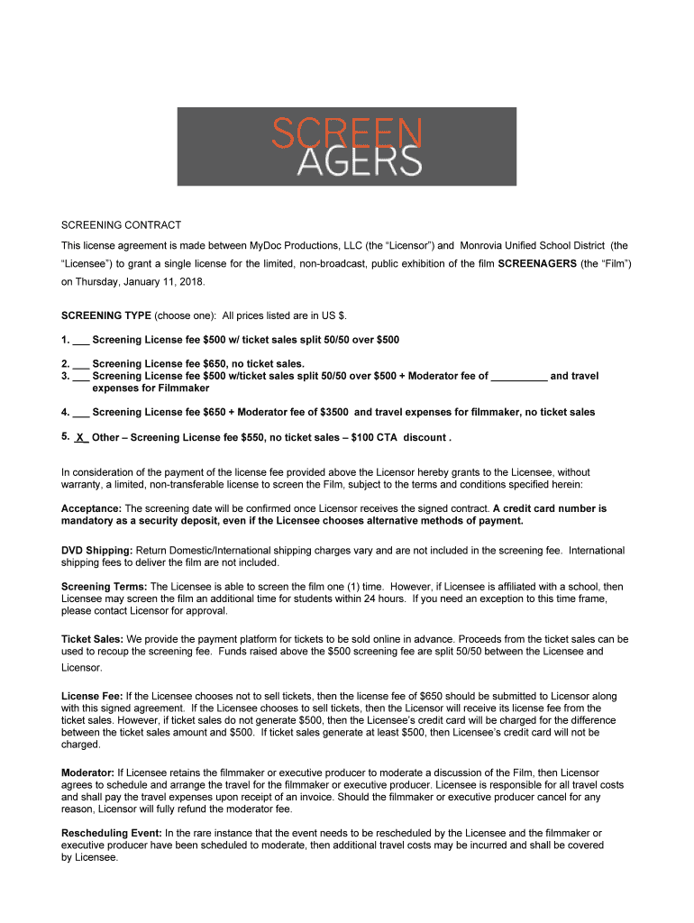SCREENING Contracts license agreement is made between MDC Productions, LLC (the Licensor) and Monrovia Unified School District (the Licensee) to grant a single license for the limited, nonbroadcast,